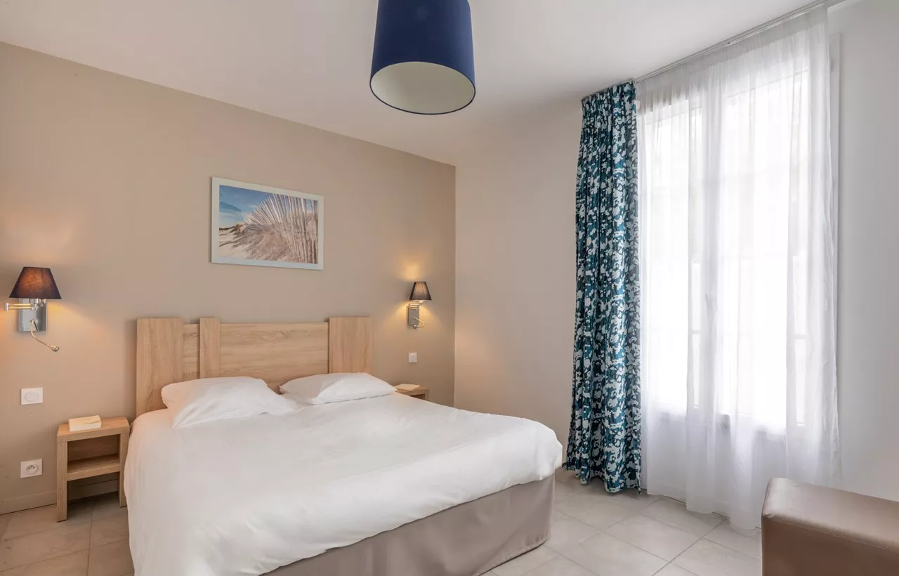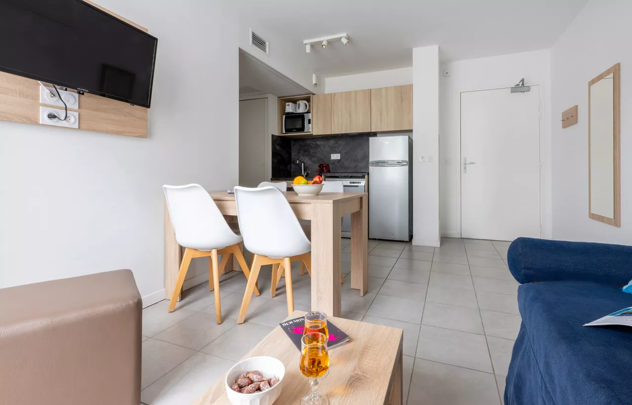 Séjour avec 1 canapé lit. Chambre avec 1 lit double. Salle de bain avec baignoire (ou douche dans appartement pour PMR) et sèche-cheveux. Kitchenette équipée avec lave-vaisselle, ménagère complète, plaques de cuisson, micro-onde (option grill), réfrigérateur avec congélateur, bouilloire, cafetière et grille-pain.