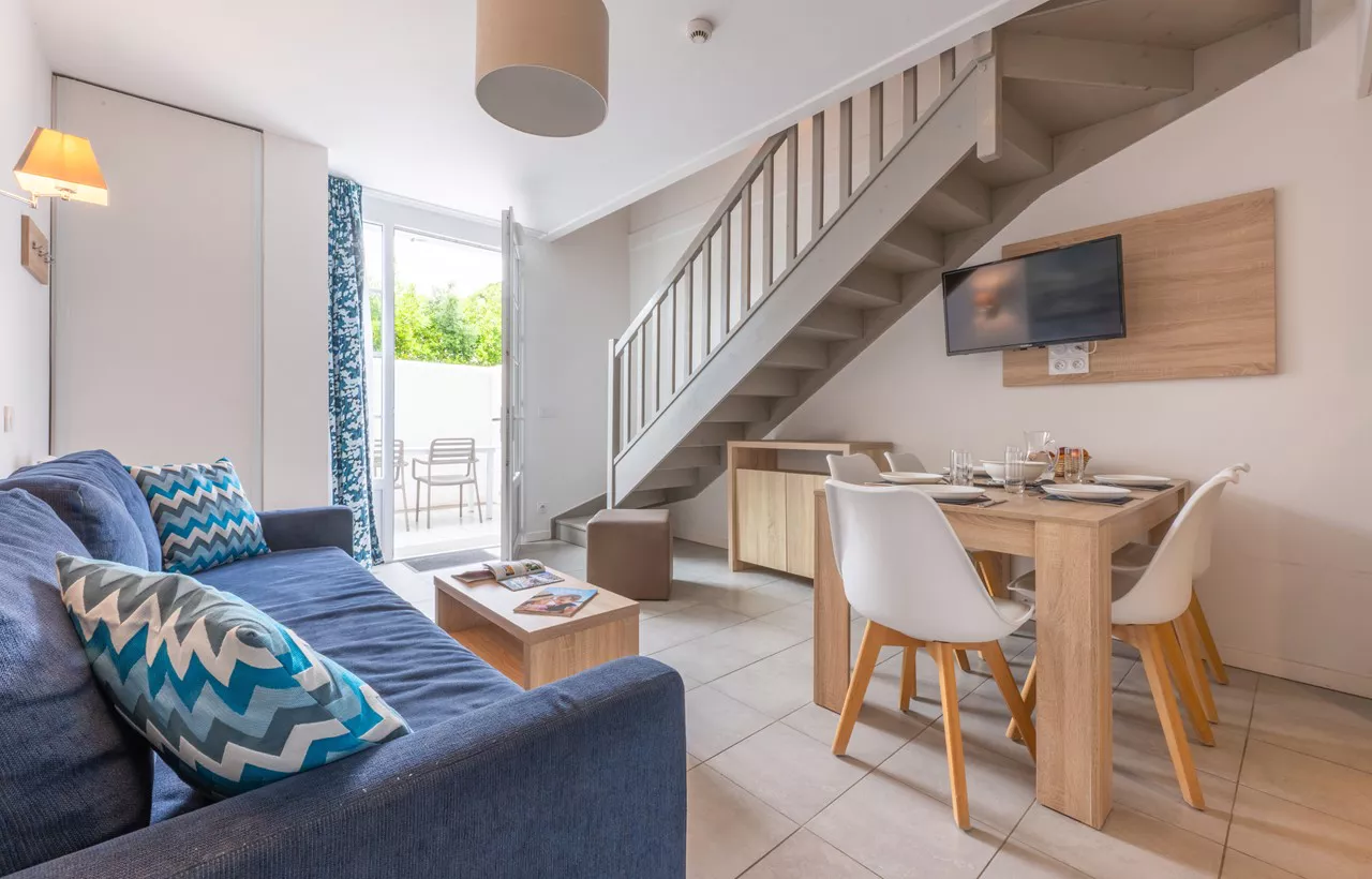 Séjour avec 1 canapé lit. Chambre avec 1 lit double. Salle de bain avec baignoire (ou douche dans appartement pour PMR) et sèche-cheveux. Kitchenette équipée avec lave-vaisselle, ménagère complète, plaques de cuisson, micro-onde (option grill), réfrigérateur avec congélateur, bouilloire, cafetière et grille-pain.