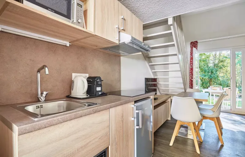 Kitchenette équipée (plaque vitrocéramique, micro-ondes/gril, réfrigérateur, lave-vaisselle, cafetière, bouilloire).